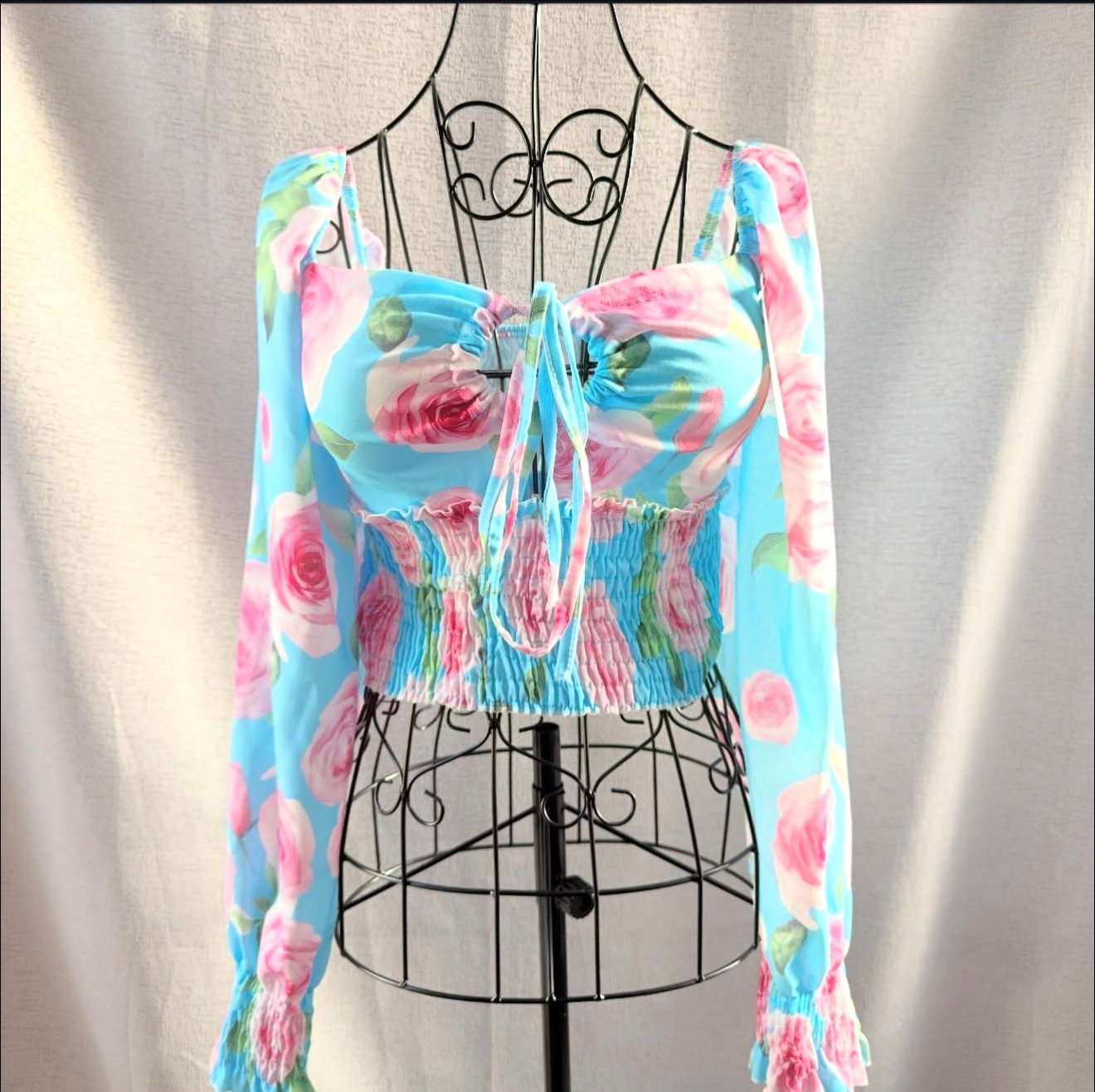 Дамски блуза с нежен флорален принт в син нюанс. Моделът е с ефирен ръкав и еластичен набор в талията, който подчертава фигурата. Горната част е с връзки и лека набрана линия за женствен и елагантен силует. Подходяща както за ежедневието, така и за по – специални поводи.