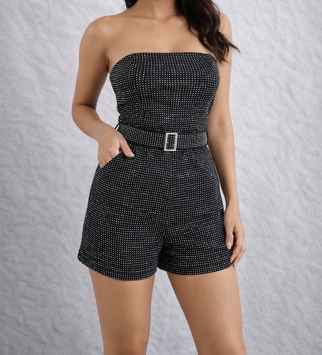 Добави стил и женственост към визията си с този елегантен гащеризон с камъни. Изчистения дизайн подчертава фигурата и създава елегантно излъчване. Подходящ както за ежедневието, така и за по – специални поводи. Би стоял прекрасно както с обувки на ток, така и със спортни обувки.