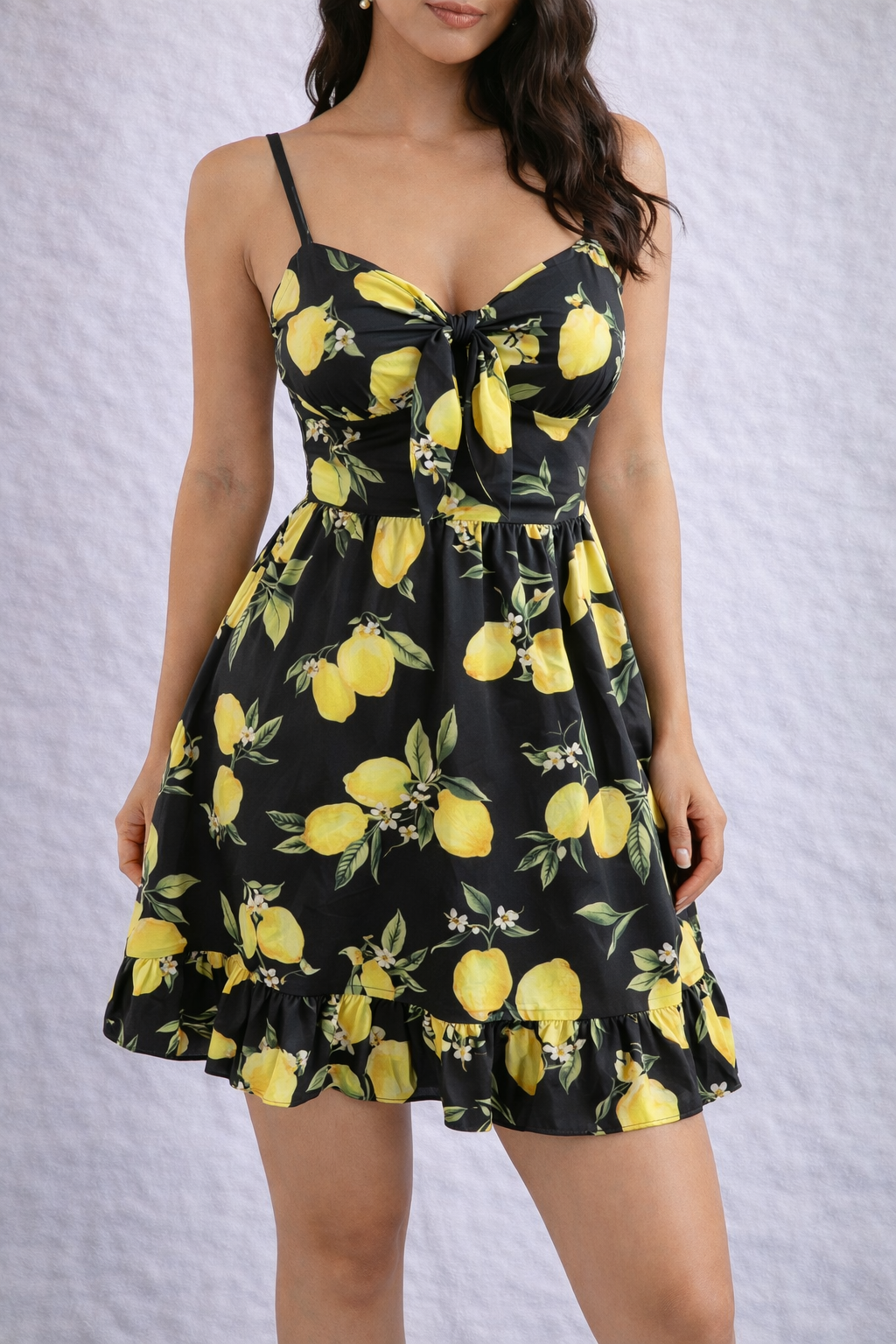 Свежа и изключително удобна – тази лятна рокля е перфектния избор за топлите дни. Моделът впечатлява с красив флорален принт с лимони. Роклята е с регулируеми тънки презрамки и елегантна връзка в предната част, която подчертава бюста и придава изключително женствен силует. Свободната кройка и леката материя осигуряват комфорт през целия ден.