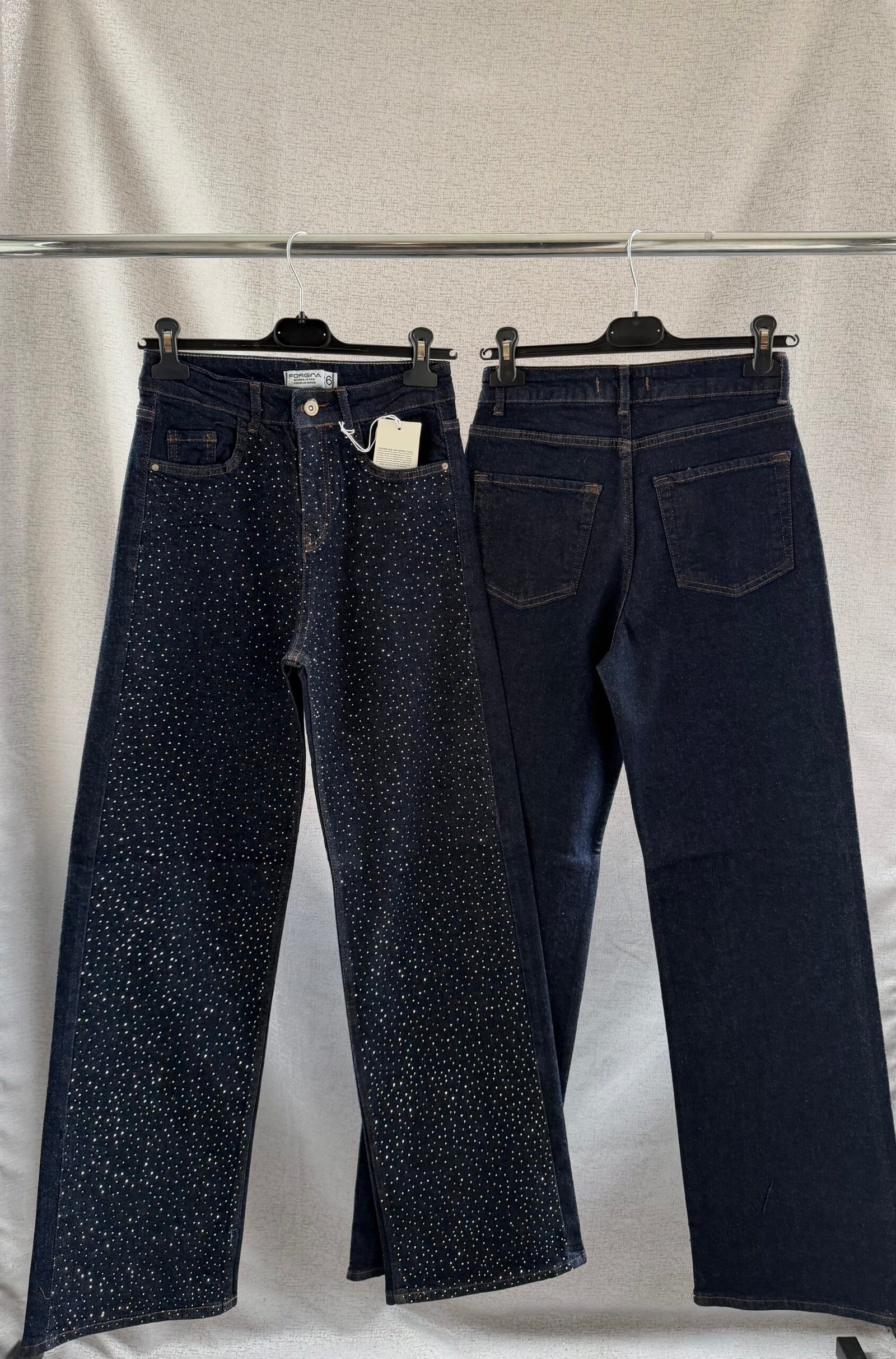 Стилни дамски дънки с камъчета в класически тъмносин цвят. Тези дънки не просто подчертават вашия стил – те са удобни и практични. Дизайнът им е съобразен с най-актуалните модни тенденции. Подходящи както за по – официална визия, така и за по – ежедневна. Този модел дънки с камъчета е универсално решение за всяка дама, която иска да изглежда безупречно.